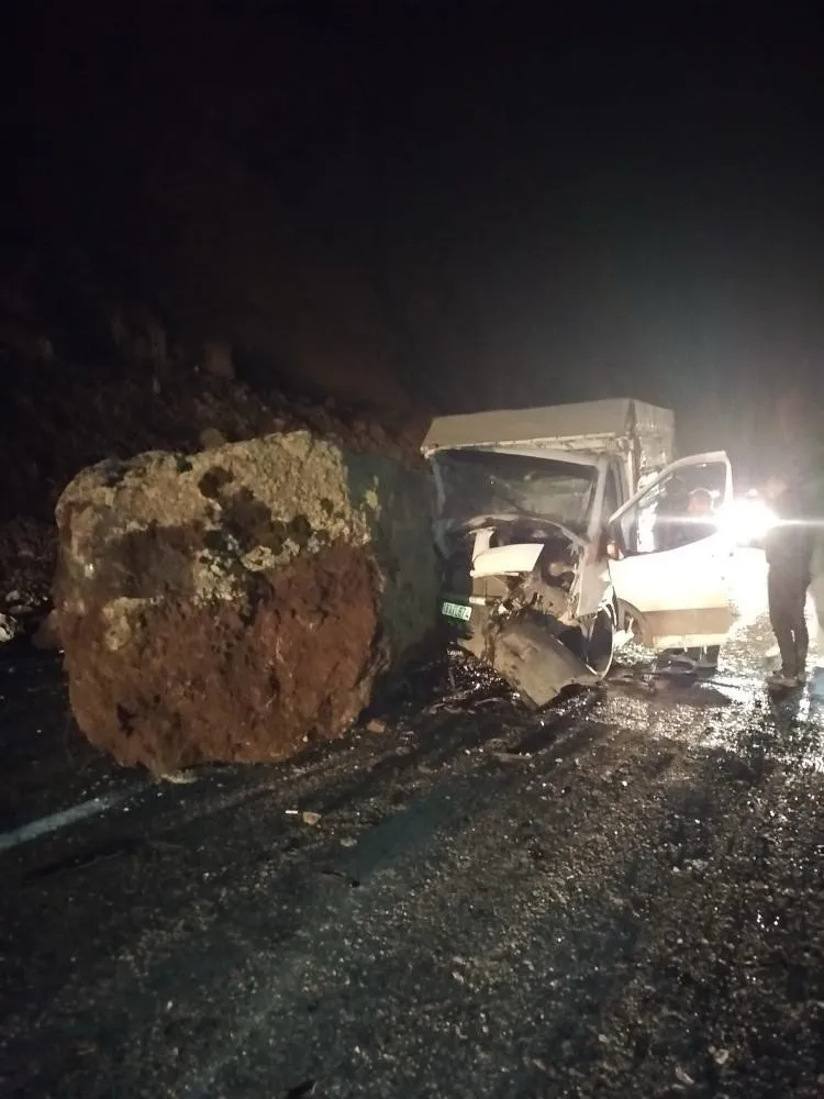 Erzurum’un Hınıs ilçesinde yola düşen dev kaya parçası iki araca çarptı. Araçlarda bulunan 2 kişi yaralandı. Edinilen bilgiye göre, dün gece yarısında Erzurum - Hınıs kara yolunda sağanak yağışla birlikte dağdan kopan dev kaya kütlesi yoldan geçen iki araçta maddi hasar oluşturdu. Araçlarda bulunan 2 kişi yaralanırken, olay yerine gelen 112 ekiplerince yaralılar yapılan ilk müdahalelerinin ardından hastaneye sevk edildi. Araçlarda büyük ölçüde hasar oluşurken dev kaya kütleleri görenleri şaşırttı.
