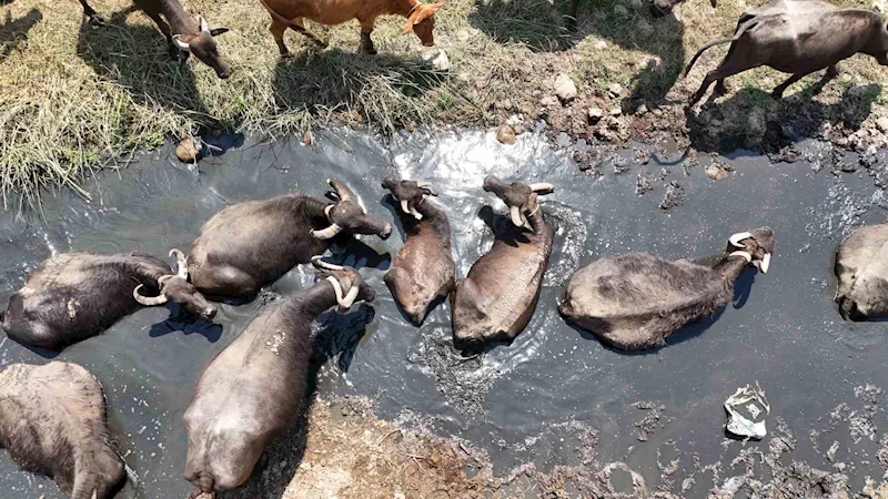 Diyarbakır’da mandaların su banyosu dronla görüntülendi