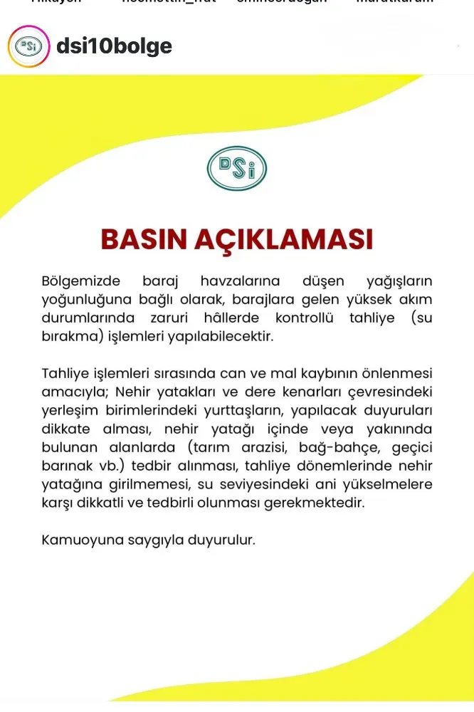 DSİ tarafından yapılan açıklamada, söz konusu duyurunun can ve mal kayıplarının önlenmesi amacıyla kamuoyuna saygıyla bildirildiği ifade edildi.