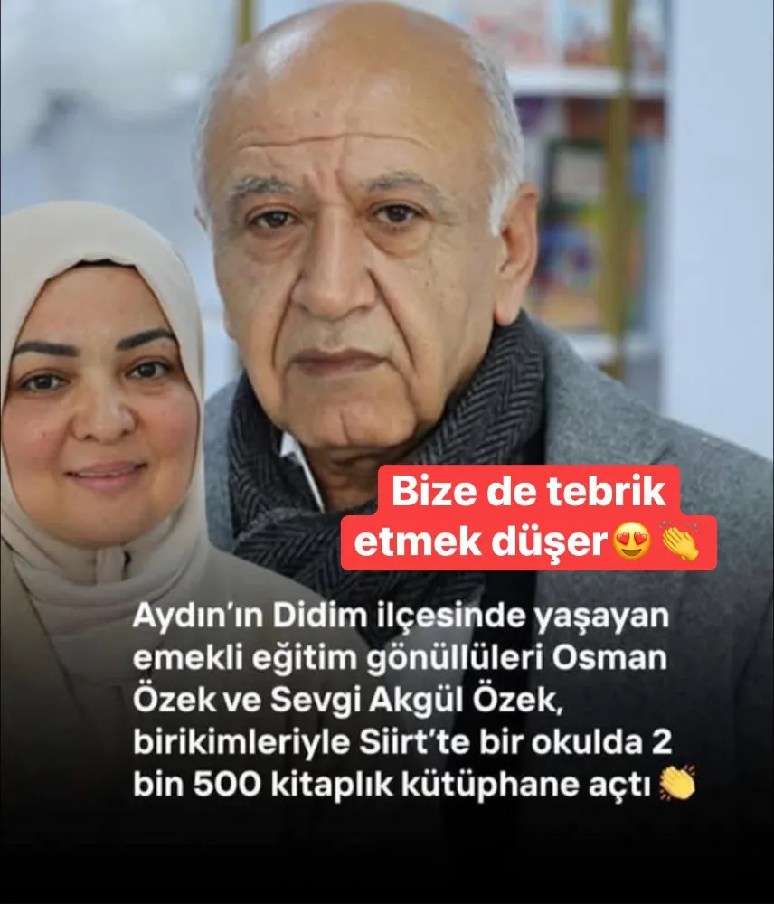 Aydın’ın Didim ilçesinde yaşayan emekli eğitim gönüllüleri Osman Özek ve eşi Sevgi Akgül Özek, yılların birikimini öğrencilerle buluşturarak Siirt’te bir okulda yaklaşık 2 bin 500 kitaplık kütüphane kurulmasına öncülük etti.