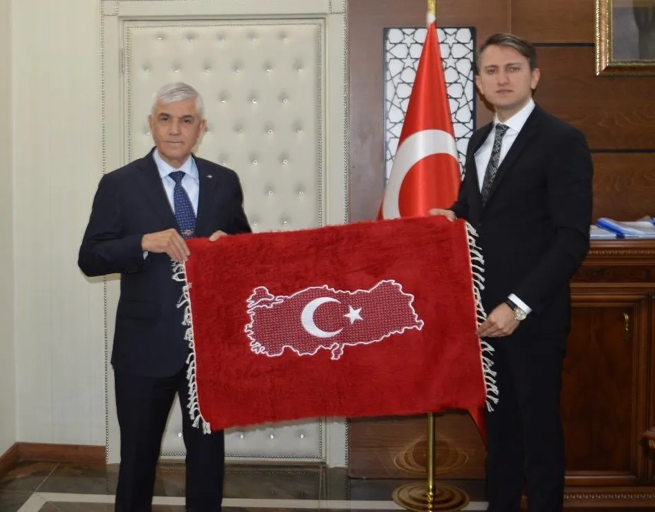 Kaymakam Özcan , ziyaret anısına, Orgeneral Çetin’e şanlı Türk bayrağı işlemeli bir tiftik battaniyesi hediye etti.