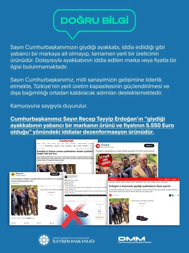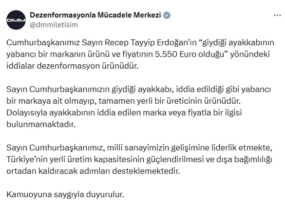 İletişim Başkanlığı Dezenformasyonla Mücadele Merkezi, yaptığı açıklamada bu haberlerin gerçeği yansıtmadığını belirtti. Açıklamada, "Cumhurbaşkanımız Sayın Recep Tayyip Erdoğan’ın giydiği ayakkabı yabancı bir markaya ait değil, tamamen yerli bir üreticinin ürünüdür" denildi.