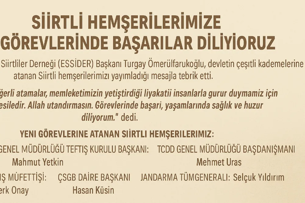 Eskişehir Siirtliler Derneği (ESSİDER) Başkanı Turgay Ömerülfarukoğlu, devletin önemli kurumlarında üst düzey görevlere atanan kıymetli Siirtli hemşerilerimizi yayımladığı yazılı açıklamayla kutladı.