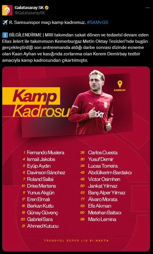 Süper Lig’in dev ekibi Galatasaray, Samsunspor maçı öncesi kadro sıkıntısı yaşıyor. Sarı-Kırmızılı ekipte Elias Jelert, Kaan Ayhan ve Kerem Demirbay, sakatlıkları nedeniyle kamp kadrosuna alınmadı.