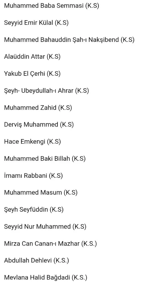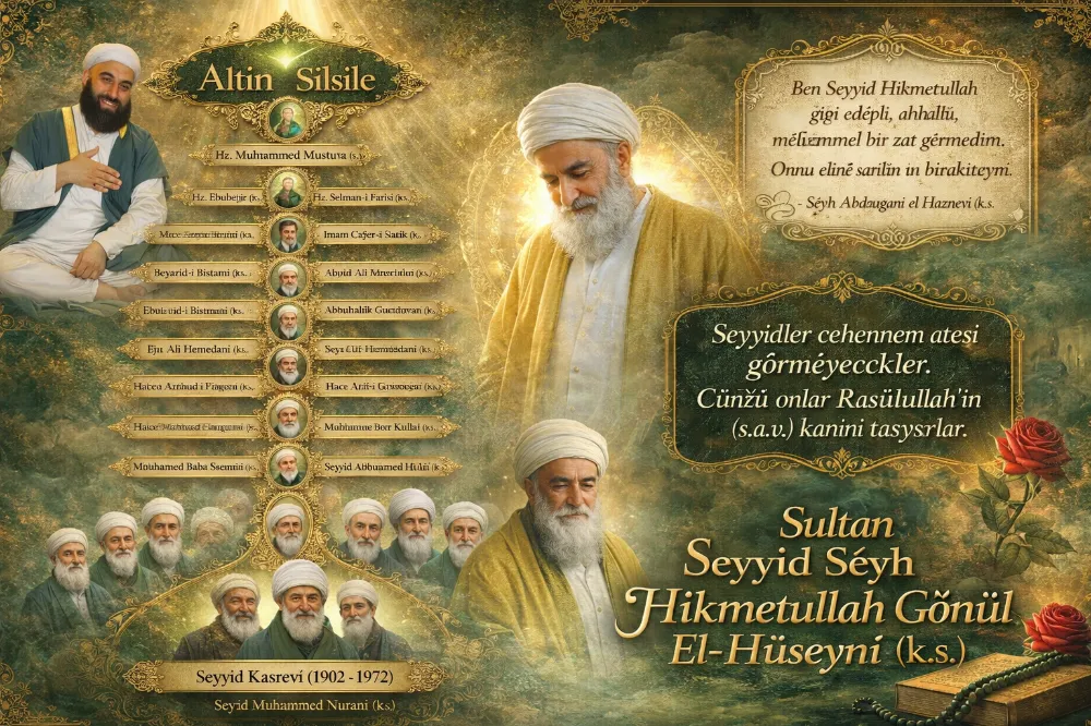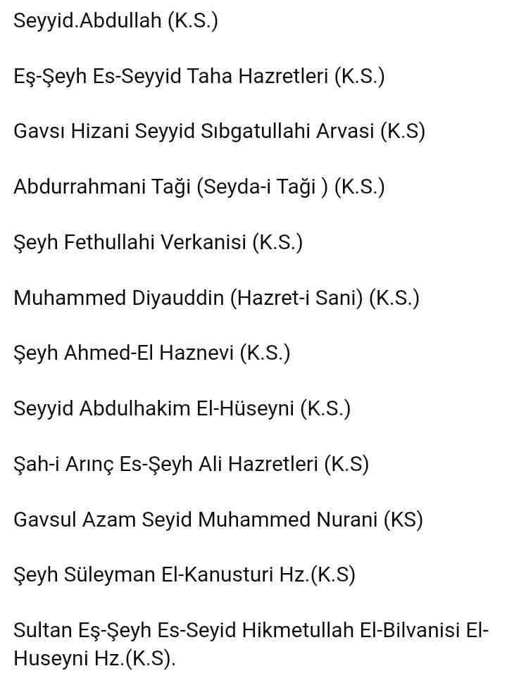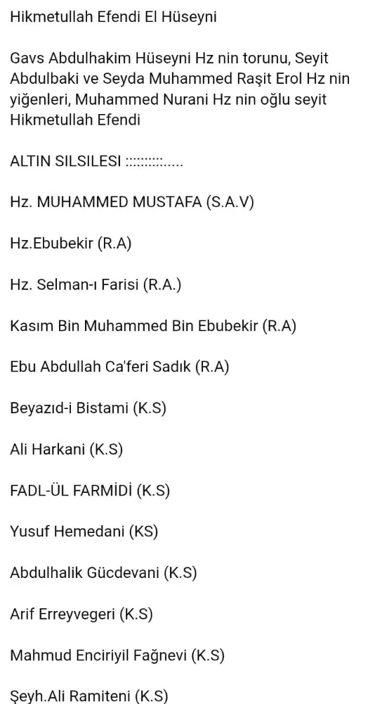 Paylaşılan görsellerde yer alan ve Nakşibendî yolun omurgasını oluşturan Altın Silsile, Seyyid Hikmetullah Efendi’nin temsil ettiği irfan çizgisini açıkça göstermektedir: