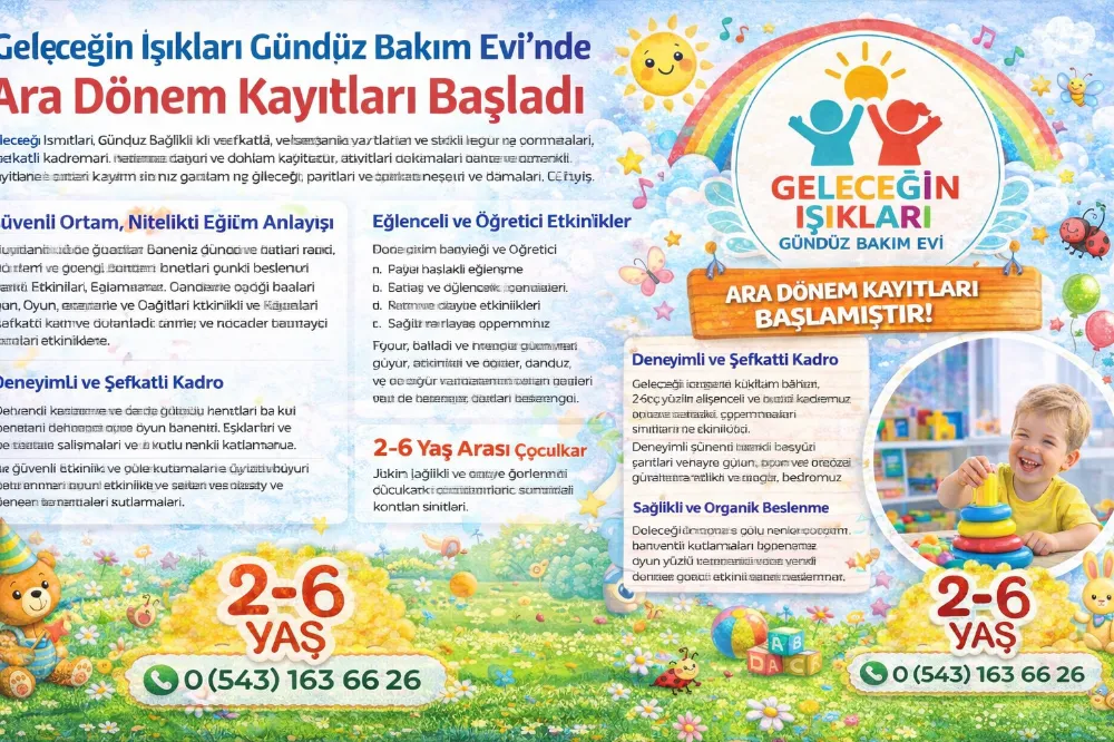 Çocukların güvenli, sağlıklı ve nitelikli bir ortamda büyümesini esas alan Geleceğin Işıkları Gündüz Bakım Evi, ara dönem kayıtlarını başlattığını duyurdu. 2–6 yaş aralığındaki çocuklara yönelik hizmet veren bakım evi, hem eğitim hem de bakım alanında sunduğu kapsamlı imkânlarla ailelerin dikkatini çekiyor.
