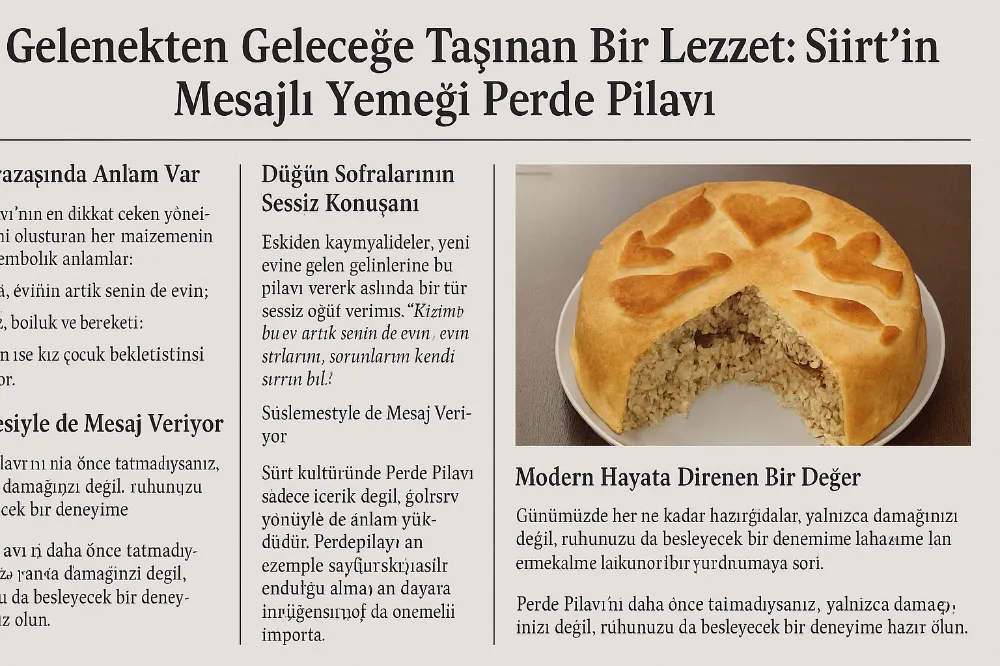 Siirt mutfağının incisi olan Perde Pilavı, sadece bir yemek değil; aynı zamanda yüzyıllar öncesinden bugüne taşınan kültürel bir miras, bir aile içi mesaj dili ve toplumsal değerlerin yemeğe yansıyan hali olarak karşımıza çıkıyor. Kökeni Orta Asya’ya uzanan bu özel yemek, Siirt’te düğün sofralarının, özel günlerin ve misafir ağırlamanın vazgeçilmezi olmayı sürdürüyor.