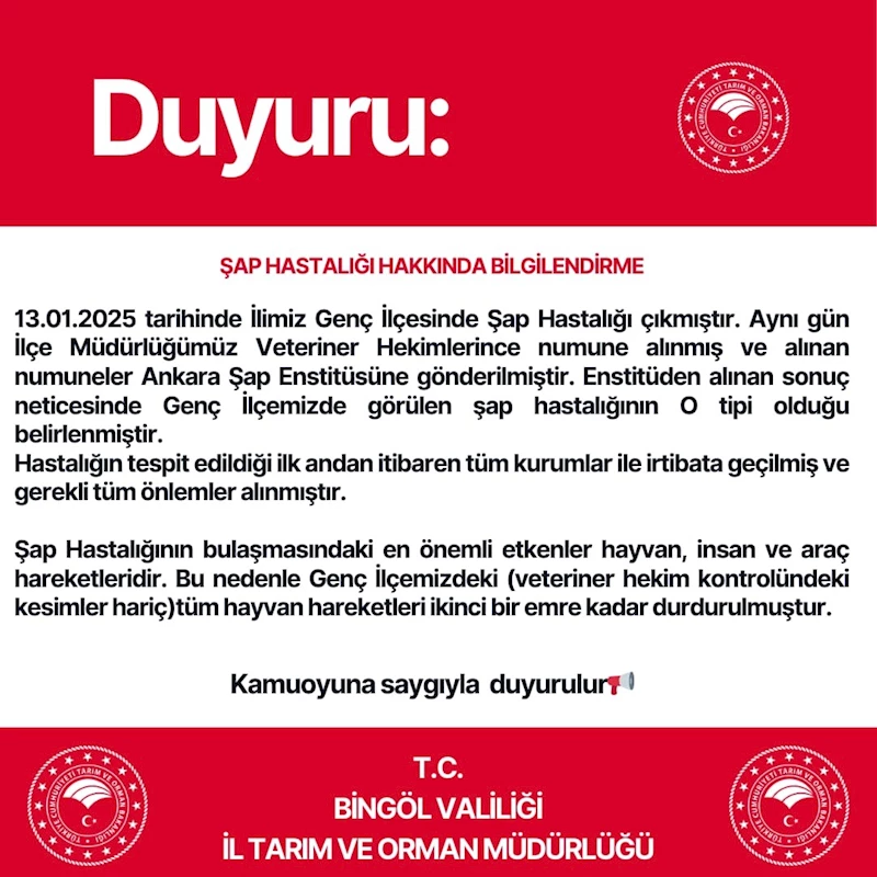 Bingöl İl Tarım ve Orman Müdürlüğü’nden yapılan açıklamada, "13 Ocak 2025 tarihinde ilimiz Genç ilçesinde şap hastalığı çıkmıştır. Aynı gün İlçe Müdürlüğümüz veteriner hekimlerince numune alınmış ve alınan numuneler Ankara Şap Enstitüsüne gönderilmiştir. Enstitüden alınan sonuç neticesinde Genç ilçemizde görülen şap hastalığının O tipi olduğu belirlenmiştir. Hastalığın tespit edildiği ilk andan itibaren tüm kurumlar ile irtibata geçilmiş ve gerekli tüm önlemler alınmıştır. Şap hastalığının en büyük belirtileri ağızda salya, ağız, dil ve ayaklarda oluşan yaralardır. Şap hastalığının bulaşmasındaki en önemli etkenler hayvan, insan ve araç hareketleridir. Bu nedenle Genç ilçemizdeki (veteriner hekim kontrolündeki kesimler hariç) tüm hayvan hareketleri ikinci bir emre kadar durdurulmuştur. Kesime gönderilen hayvanlar için her türlü temizlik ve dezenfeksiyon işlemleri kesimhaneyi de kapsayacak şekilde başlatılmıştır. Alınan sıkı tedbirler sonucunda hastalık çıktığı bölgede kontrol altına alınmış, ilimizde an itibarıyla başka bir bölgeye bulaşması engellenmiştir. Bu nedenle yetiştiricilerimizin panik yapmadan işletmelerine yabancı kişileri sokmamaları, kendilerinin de başka işletmelere girip çıkmamaları, hayvan alım-satımını durdurmaları veya alacaklarsa yeni aldıkları hayvanlarını diğer hayvanlarının içine katmadan en az 21 gün başka bir bölmede karantinada tutmaları, 21 gün sonunda hastalık belirtisi göstermedikleri takdirde hayvanlarının içine katmaları, ahır girişlerinde dezenfektan veya sönmemiş kireç bulundurmaları ve aşılama için gelen veteriner hekimlere yardımcı olup tüm hayvanlarını mutlaka aşılatmaları büyük önem arz etmektedir" denildi.