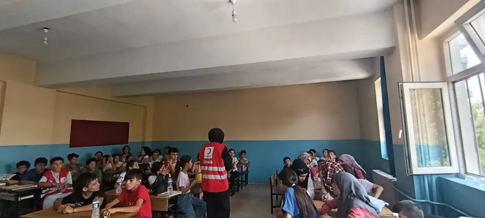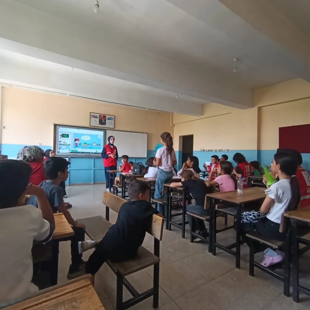Genç Kızılay gönüllüleri, olası doğal afetler karşısında alınması gereken ilk önlemler, çanta hazırlığı ve güvenli toplanma alanları konusunda öğrencileri bilgilendirdi.