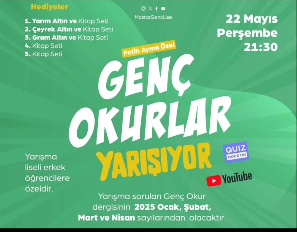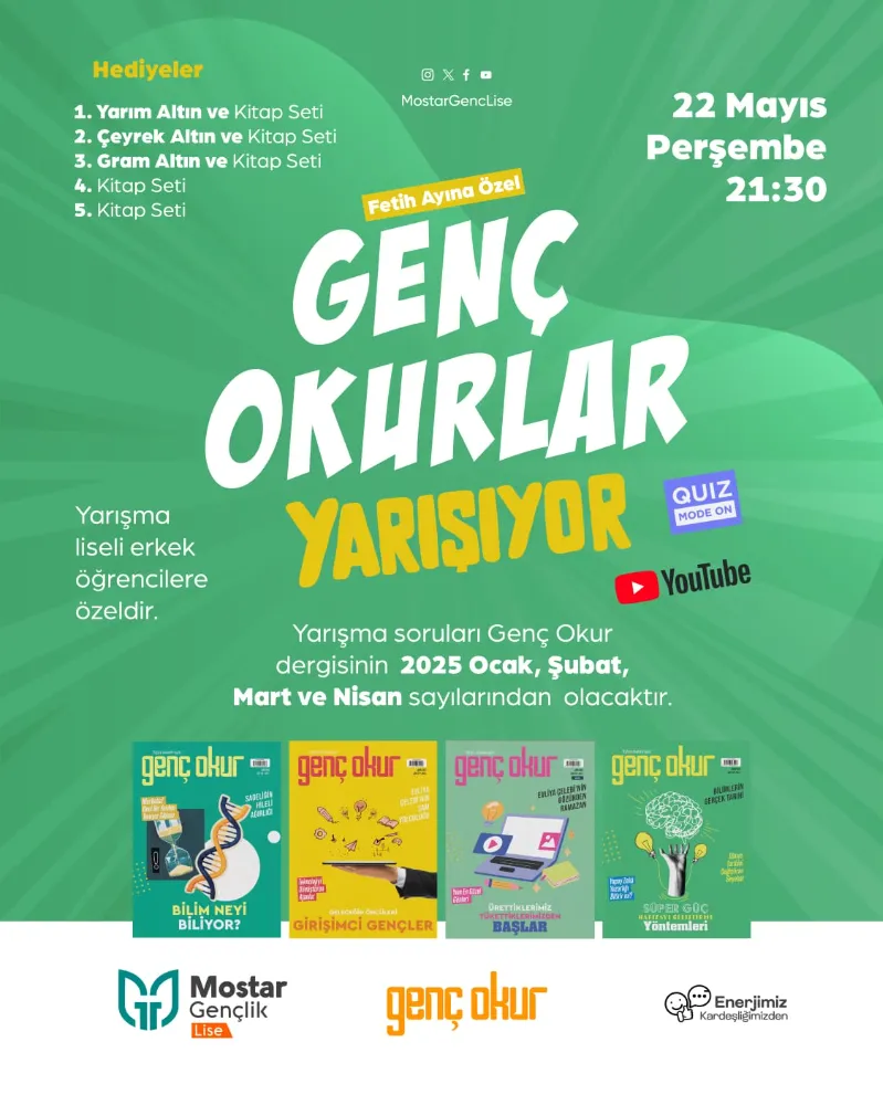 Fetih ayına özel olarak düzenlenen “Genç Okurlar Yarışıyor” adlı bilgi yarışması, lise düzeyindeki erkek öğrencileri hem eğlenceli hem de ödüllü bir bilgi serüvenine davet ediyor.