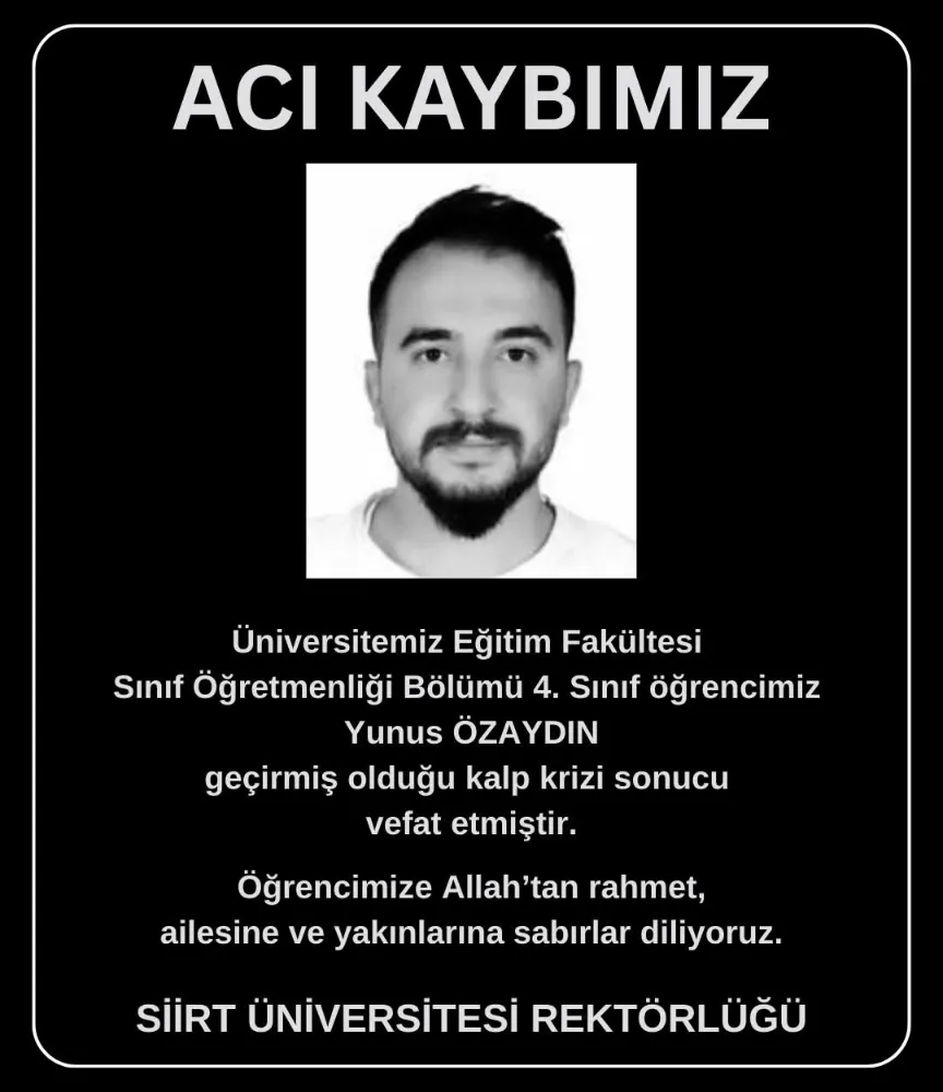 Siirt Üniversitesi Eğitim Fakültesi Sınıf Öğretmenliği Bölümü 4. sınıf öğrencisi Yunus Özaydın, geçirdiği kalp krizi sonucu hayatını kaybetti. Üniversite yönetimi tarafından yapılan açıklamada, genç öğrencinin ani vefatı nedeniyle derin üzüntü duyulduğu belirtilirken, ailesine ve sevenlerine başsağlığı dilendi.