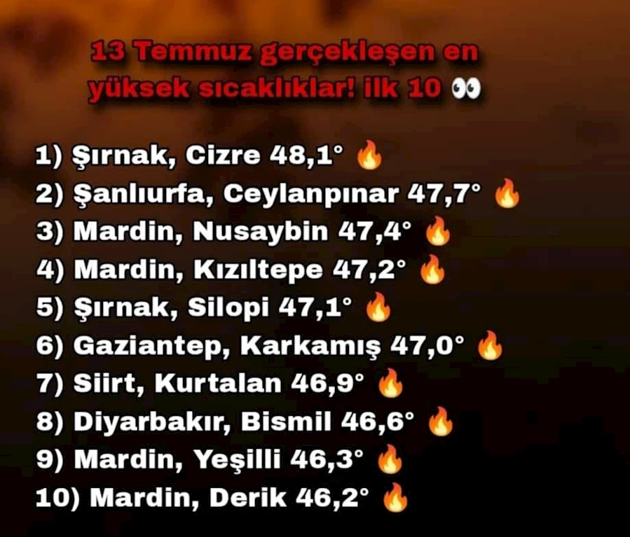 Meteoroloji kaynaklarının doğruladığı verilere göre ilk 10 sırada yer alan tüm noktalar Güneydoğu illerinden oluşurken, Mardin, Şırnak, Şanlıurfa, Siirt ve Gaziantep’in birçok ilçesinde 46°C'nin üzerine çıkıldı.