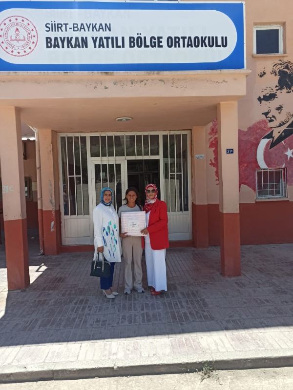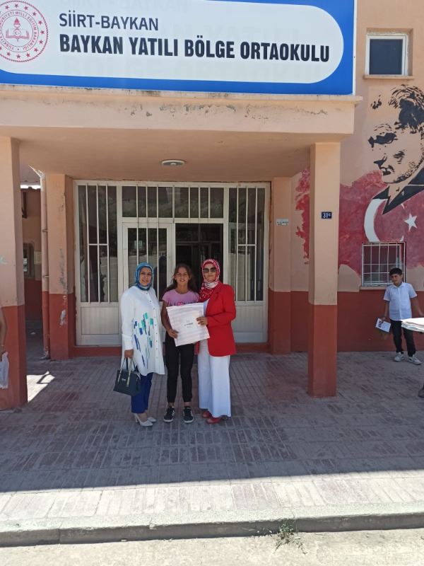 Baykan Kaymakamı/Belediye Başkanvekili Emin Bağlı’nın Eşi Hanımefendi Zeynep Bağlı beraberinde Aile Destek Merkezi Çiçek Okal ile birlikte Türkiye tenis finallerinde kız takımı Türkiye 5.si olarak başarısını gösteren Baykan Yatılı Bölge Ortaokulu Öğrencilerini Ödüllendirerek Başarılar Diledi.