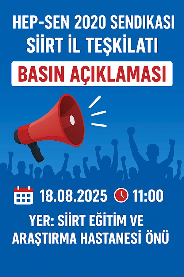 Siirt Eğitim ve Araştırma Hastanesi önünde toplanan HEP-SEN 2020 Sendikası Siirt İl Teşkilatı üyeleri, 18 Ağustos 2025 tarihinde gerçekleştirdikleri basın açıklamasında hükümete ve yetkili sendikalara sert eleştiriler yöneltti. Sağlık çalışanlarının ağır çalışma koşulları ve düşük ücretlere mahkûm edildiğini vurgulayan sendika temsilcileri, iki gün boyunca ülke genelinde iş bırakma eylemi başlattıklarını duyurdu.