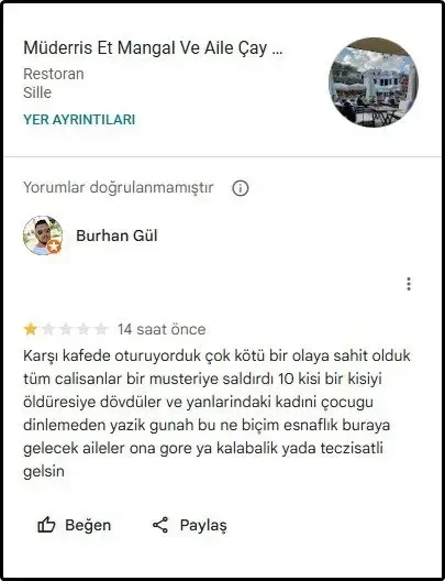 Bir görgü tanığı ise yaşanan olayı işletmenin Google yorumları kısmına yazdı. Burhan Gül isimli kullanıcı, “Tüm çalışanlar bir müşteriye saldırdı. 10 kişi bir kişiyi öldüresiye dövdüler. Kadın ve çocuğu dinlemeden. Yazık, günah. Aileler buraya gelirken dikkatli gelsin” ifadelerini kullandı.