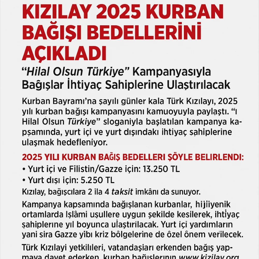 2025 Yılı Kurban Bağış Bedelleri Şöyle Belirlendi: Yurt içi ve Filistin/Gazze için: 13.250 TL Yurt dışı için: 5.250 TL Kızılay, bağışçılara 2 ila 4 taksit imkânı da sunuyor.