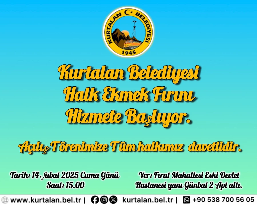 Kurtalan Belediyesi tarafından Halk Ekmek Fırını Açılıyor. Siirt İli Kurtalan İlçesinde Kurtalan Belediye tarafından Fırat Mahallesi Eski Devlet Hastanesi yanı Günbat 2 Apt altı. 14 Şubat 2025 Cuma Günü, Saat: 15.00’da açılacak olan halk ekmek fırınının açılışına tüm Kurtalan halkı davet edildi.