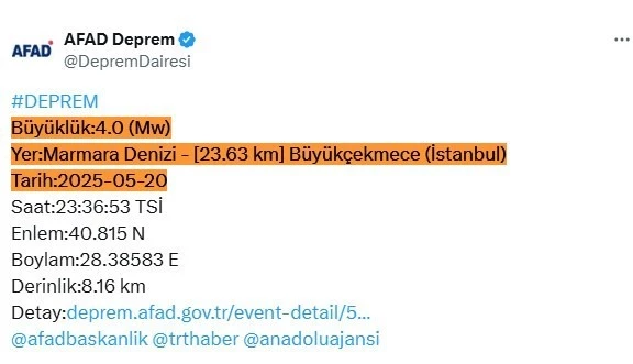 Afet ve Acil Durum Yönetimi Başkanlığı (AFAD), depremin Marmara Denizi açıklarında meydana geldiğini ve büyüklüğünün 4.0 olduğunu duyurdu.