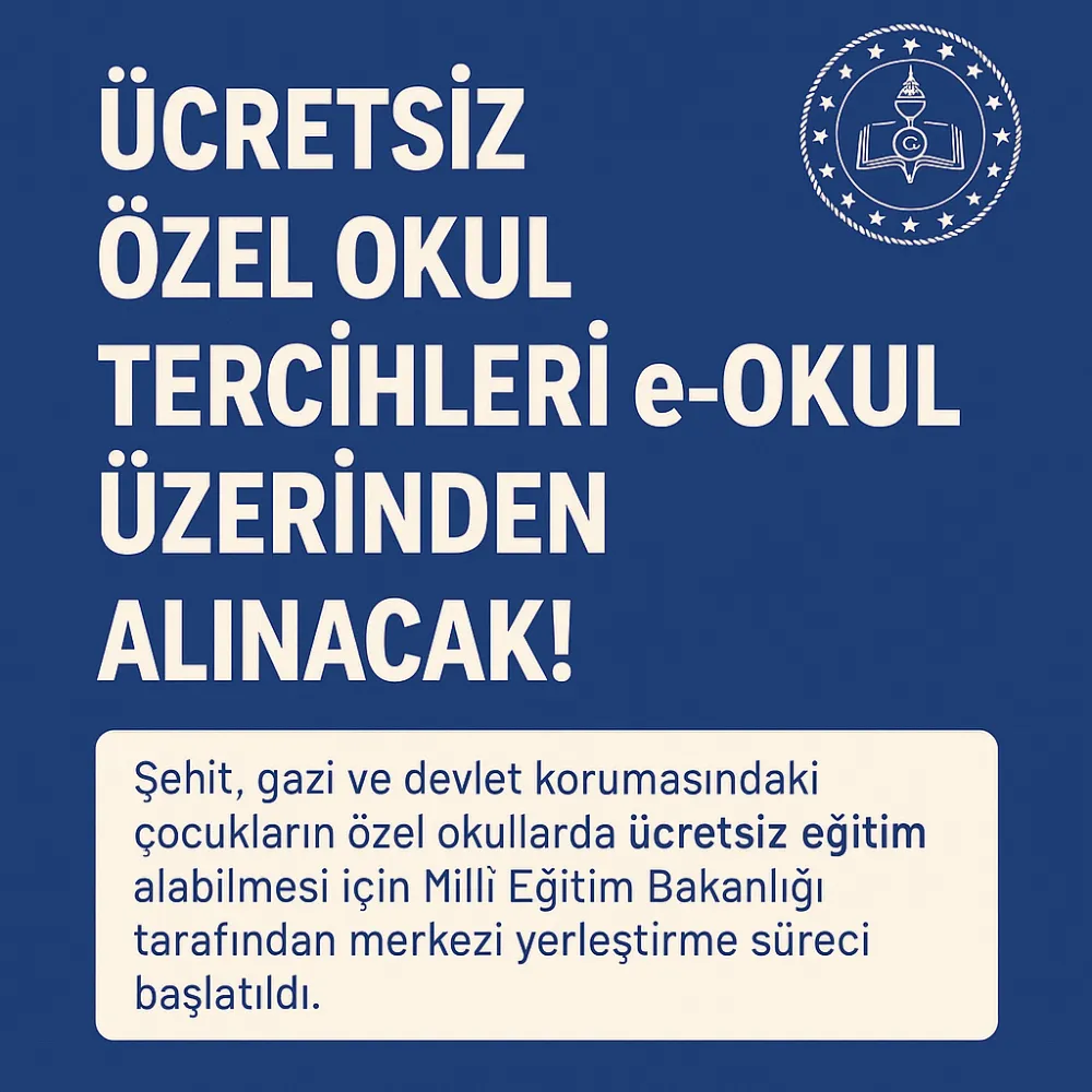 Milli Eğitim Bakanlığı (MEB), şehit ve gazi çocukları ile devlet koruması altındaki çocuklara özel okullarda ücretsiz eğitim sağlamak amacıyla merkezi yerleştirme süreci başlattı. Süreç kapsamında başvurular, 5-14 Ağustos 2025 tarihleri arasında alınacak.