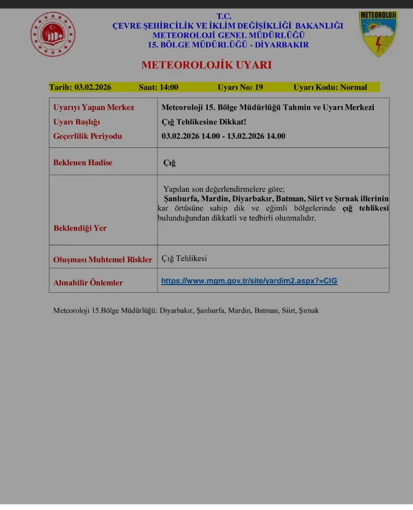 Meteoroloji 15. Bölge Müdürlüğü Tahmin ve Uyarı Merkezi tarafından yapılan açıklamada; Şanlıurfa, Mardin, Diyarbakır, Batman, Siirt ve Şırnak illerinde çığ tehlikesine dikkat çekildi. Uyarının 03 Şubat 2026 saat 14.00’ten, 13 Şubat 2026 saat 14.00’e kadar geçerli olduğu bildirildi.