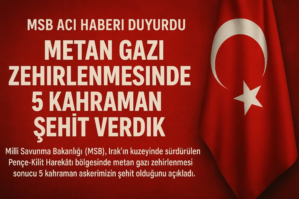 ---Milli Savunma Bakanlığı (MSB), Irak’ın kuzeyinde yürütülen Pençe-Kilit Harekâtı bölgesinden gelen yürek burkan haberi kamuoyuna duyurdu. Yapılan açıklamada, görevleri başında bulunan 5 kahraman Mehmetçiğin metan gazı zehirlenmesi sonucu şehit düştüğü bildirildi.