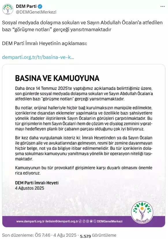 “Sayın Öcalan ile görüşen aile üyeleri, avukatlar ya da İmralı Heyeti dışındaki kaynaklardan gelen, resmi zemine dayanmayan hiçbir belge, not ya da bilgiye itibar edilmemelidir. Bu tür içeriklerin dolaşıma sokulması kamuoyunu yanıltmaya yönelik bir operasyondur.”