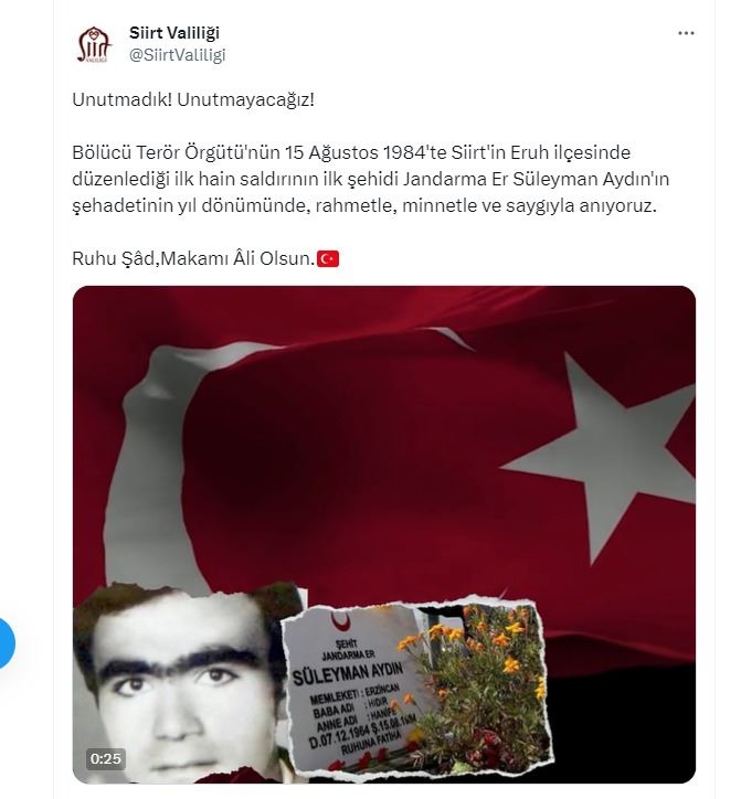 "O gün maalesef ilk şehidimiz olan Süleyman Aydın kardeşimiz şehit oldu. PKK terör örgütü hemen ardından yıllarca bölgede Eruh ve Güneydoğu ile Doğu Anadolu bölgesinde Kürt adı altında Kürt köylerinde Kürt toplumuna saldırılar düzenledi. O günden bugüne binlerce alçakça saldırılar yaptı. Çoluk çocuk demeden kundakta ki bebeğe kadar saldıran alçak bir terör örgütüdür. Ama o günde bizler dimdik ayaktaydık bugünde dimdik ayaktayız ve son terörist yok olana kadar bizler onlara karşı mücadelemizi sürdüreceğiz."