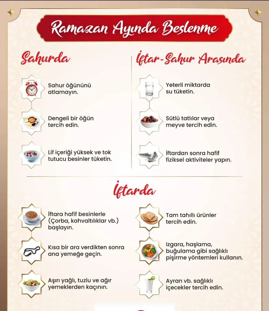 İftar sofralarında: Aşırı yağlı ve tuzlu yemeklerden kaçınılmalı, Izgara, haşlama veya buğulama yöntemleri tercih edilmeli, Tam tahıllı ürünler tüketilmeli, Ayran gibi sağlıklı içecekler tercih edilmeli.