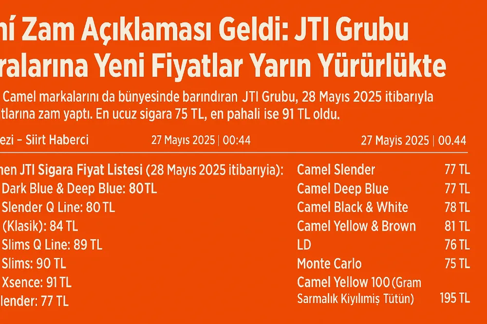 Winston ve Camel markalarını da bünyesinde barındıran JTI Grubu, 28 Mayıs 2025 itibariyle sigara fiyatlarına zam yaptı. En ucuz sigara 75 TL, en pahalı ise 91 TL oldu.