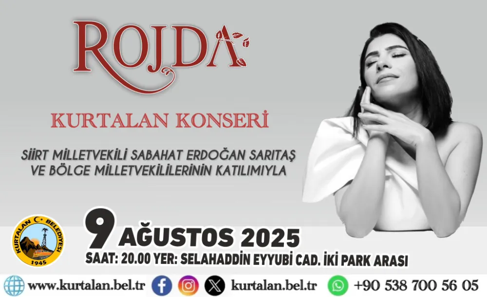 Kurtalan Belediyesi tarafından düzenlenen açıkhava konseri, 9 Ağustos 2025 Cumartesi akşamı saat 20.00’de Selahaddin Eyyübi Caddesi üzerinde, İki Park arasında gerçekleştirilecek.