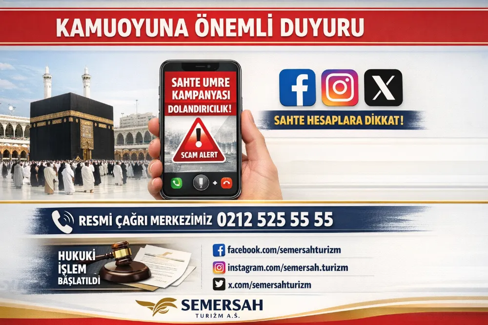 Şirket yetkililerinden edinilen bilgilere göre, bazı kişi ve hesaplar, Semerşah Turizm adına kampanyalı umre satışı yapıldığı iddiasıyla vatandaşları telefon ve WhatsApp üzerinden arayarak yanıltmaya çalışıyor.