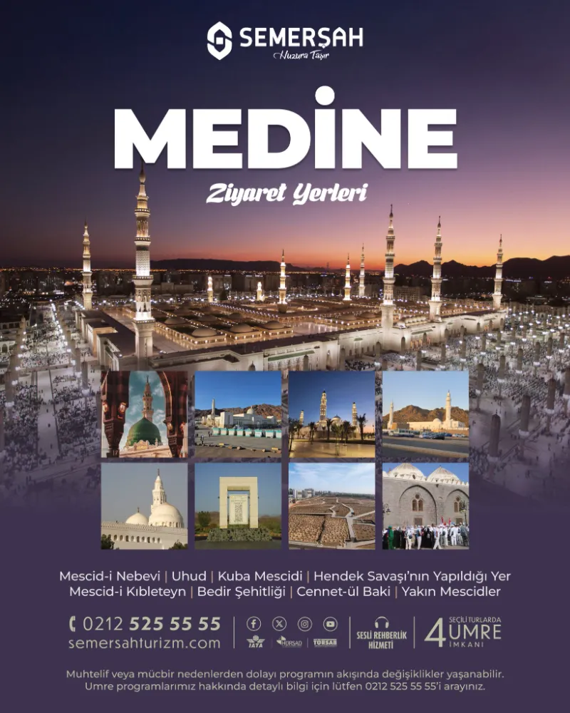 Semerşah Turizm öncülüğünde düzenlenen 2025 Umre programı kapsamında, kutsal topraklara yolculuk eden ziyaretçiler, Medine-i Münevvere’de İslam tarihinin en mübarek mekânlarını yakından görme imkânı bulacak. Manevi atmosferiyle gönülleri fetheden bu ziyaretlerde rehber eşliğinde hem ibadet hem de tarihi bilinç bir arada yaşanacak.
