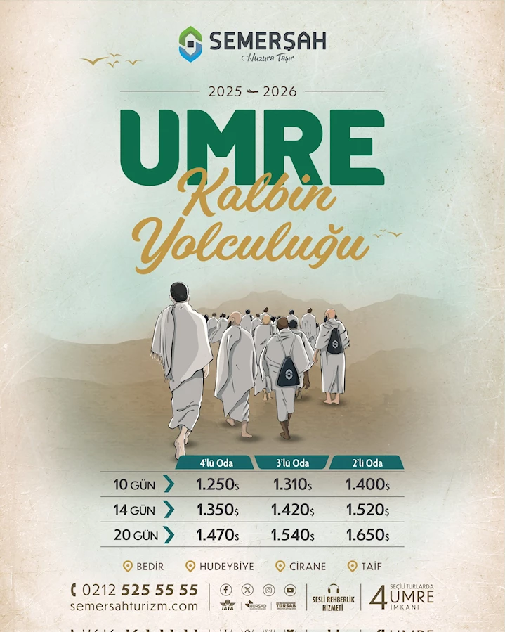Semerşah yetkilileri, “Manevi atmosferi en güzel şekilde yaşatacak bir hizmet sunmayı hedefliyoruz. Eylül – Ekim ayları için planlanan umre programlarımızda yer almak isteyen vatandaşlarımızı sitemize ve iletişim ofislerimize bekliyoruz” açıklamasında bulundu.