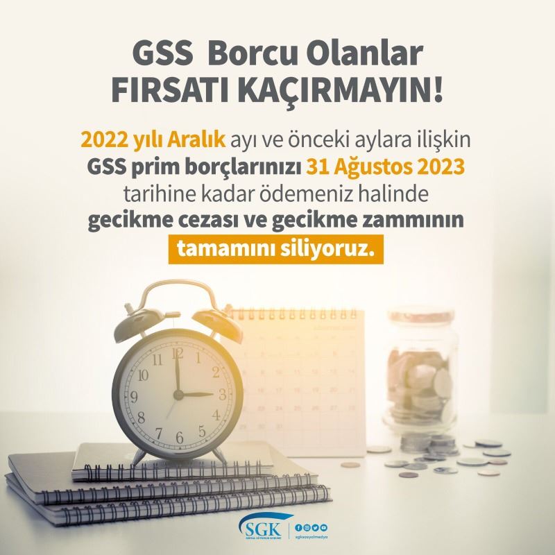 Sosyal Güvenlik Kurumundan (SGK) yapılan açıklamada” 2022 yılı Aralık ayı ve önceki aylara ilişkin GSS prim borçlarını 31 Ağustos 2023 tarihine kadar ödemeniz halinde gecikme cezası ve gecikme zammının tamamını siliyoruz.”