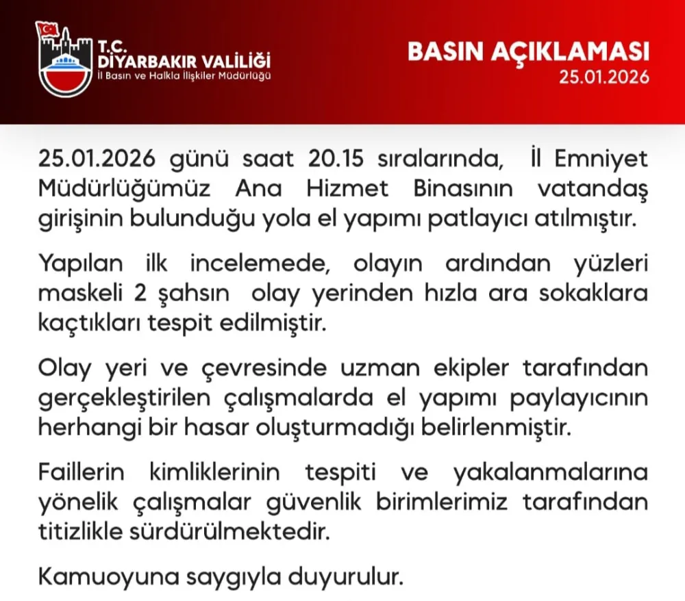 Diyarbakır Valiliği tarafından yapılan resmi basın açıklamasına göre, 25 Ocak 2026 günü saat 20.15 sıralarında İl Emniyet Müdürlüğü Ana Hizmet Binası’nın vatandaş girişinin bulunduğu yola el yapımı patlayıcı atıldı.