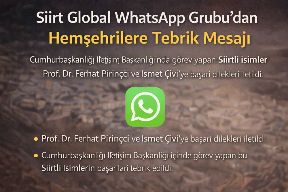 Siirtli isimler, Türkiye’nin önemli kurumlarında üstlendikleri görevlerle dikkat çekmeye devam ediyor. Bu kapsamda, Cumhurbaşkanlığı İletişim Başkanlığı bünyesinde görev yapan Prof. Dr. Ferhat Pirinçci ve İsmet Çivi için Siirt Global WhatsApp Grubu tarafından tebrik mesajı yayımlandı.