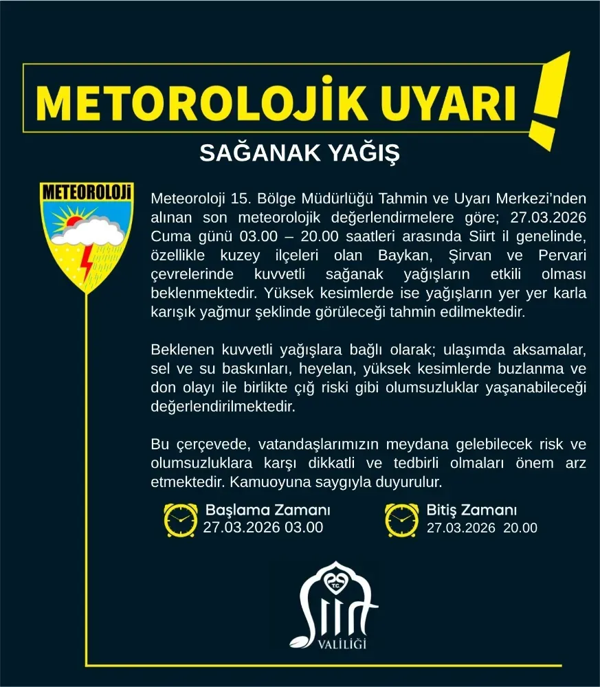 Siirt genelinde etkili olması beklenen kuvvetli sağanak yağış için kritik saatler açıklandı. Meteorolojik değerlendirmelere göre, 27 Mart 2026 Cuma günü sabah saatlerinden itibaren başlayacak yağışların gün boyu etkisini sürdürmesi bekleniyor.