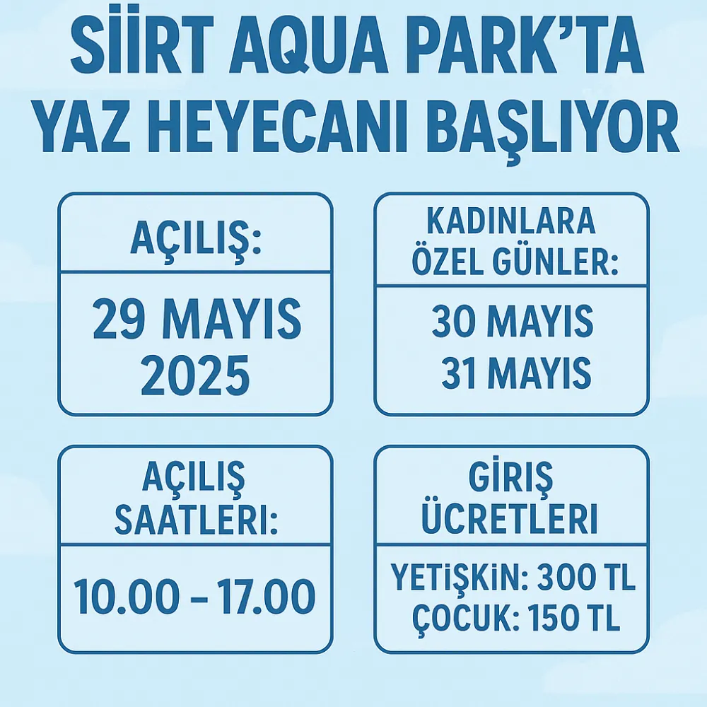 Siirt İl Özel İdaresi tarafından yapımı tamamlanan ve yaz aylarında serinlemek isteyenler için önemli bir sosyal alan olacak Aqua Park, sezonu açıyor. Açılış tarihi ve kullanım detayları kamuoyuyla paylaşıldı.