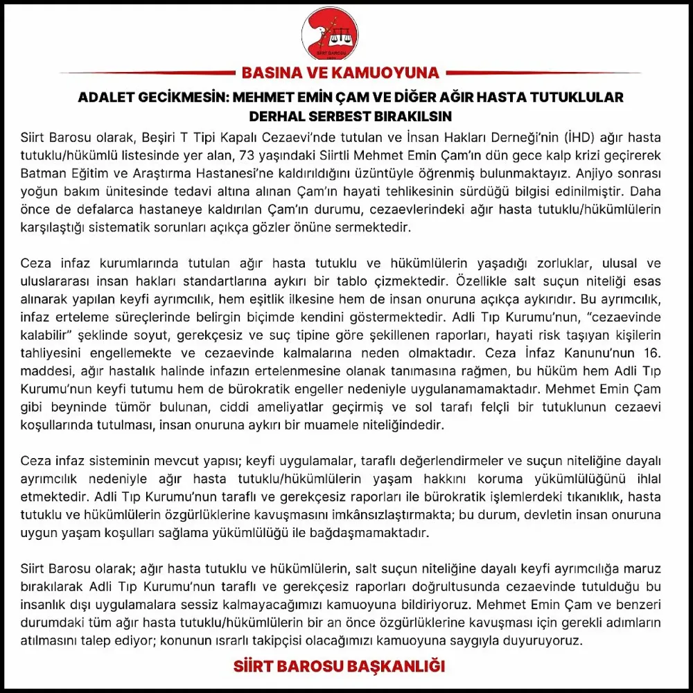 Siirt Barosu’nun yaptığı basın açıklamasında, İnsan Hakları Derneği’nin (İHD) ağır hasta tutuklu listesinde yer alan Mehmet Emin Çam’ın dün gece kalp krizi geçirdiği, Batman Eğitim ve Araştırma Hastanesi’nde anjiyo işlemi yapıldıktan sonra yoğun bakıma alındığı belirtildi. Açıklamada, Çam’ın sağlık durumunun ciddiyetini koruduğu ifade edildi.