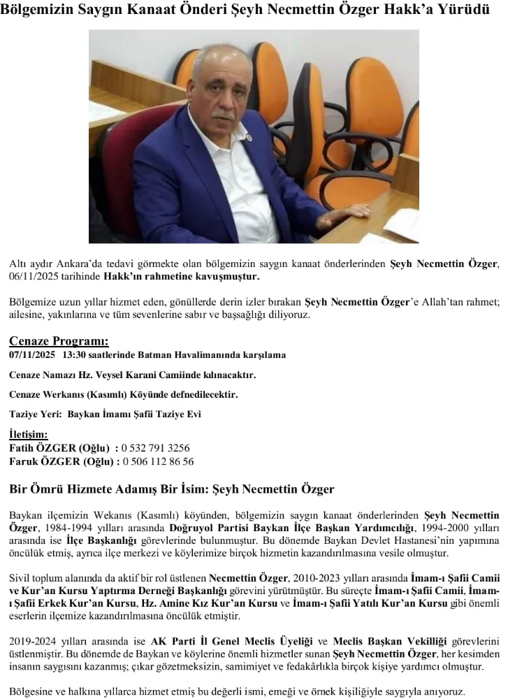 Siirt ve Baykan bölgesinde uzun yıllar boyunca başarılı çalışmalarıyla büyük izler bırakan, bölgenin sevilen siyasetçi, kanaat önderlerinden Şeh Necmettin Özger, 06 Kasım 2025 tarihinde Ankara’da tedavi gördüğü hastanede Hakk’ın rahmetine kavuştu.