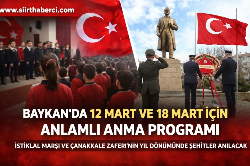 Siirt’in Baykan ilçesinde, 12 Mart İstiklal Marşı’nın Kabulü ve 18 Mart Çanakkale Zaferi ile Şehitleri Anma Günü kapsamında kapsamlı bir anma programı gerçekleştirilecek.