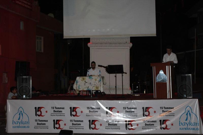 Anma programına, Kaymakam/Belediye Başkanvekili Emin Bağlı, Baykan Cumhuriyet Başsavcısı Mustafa Fatih Okumuş, Cumhuriyet Savcısı İlham YAZ, Veyselkarani Belde Belediye Başkanı Murat AKGÜN, Atabağı Belde Belediye Başkan vekili, İlçe Jandarma bölük Komutanı Vekili Jandarma Üsteğmen Süleyman Çakır, İlçe Emniyet Amir İbrahim Gökhan Arıkan, AK Parti İlçe Başkanı Nimetullah Gönül, Baykan Eski Belediye Başkanı Mehmet Ali Erol, İlçe Müftü vekili Rauf Geylani, İlçe milli eğitim Müdürü Vahap Gülmez, İl genel meclis üyeleri Necmettin Özger, Cahid Türrköz,Şehit ve Gaziler derneği Başkanı Cemal Sarıyer, Esnaf ve Sanatkarlar Odası Başkanı Osman Gülümser, Yeni ziyaret Belediye Spor Başkanı,Palmiyem Otel sahibi Hifzullah Yeşil, Siyasi Parti ve sivil toplum kuruluşu temsilcileri, Muhtarlar, Kamu Kurum ve Kuruluşları Amir ve müdürleri ve Vatandaş katıldı. Programda; katılımcılara çeşitli ikramlar yapılırken ,Saat 00.13'de Sala okunması sonrası vatandaşlara ayrıca Çorba ikram edildi,akabinde program son buldu.