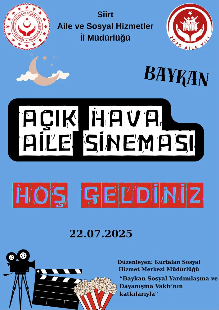 --2025 yılı “Aile Yılı” kapsamında Siirt Aile ve Sosyal Hizmetler İl Müdürlüğü öncülüğünde, Kurtalan Sosyal Hizmet Merkezi koordinasyonunda, Baykan Sosyal Yardımlaşma ve Dayanışma Vakfı'nın katkılarıyla Baykan 15 Temmuz Demokrasi Meydanı'nda “Açık Hava Aile Sineması” etkinliği düzenlendi. İlçe halkının yoğun ilgi gösterdiği etkinlik, özellikle ailelerin birlikte zaman geçirmesi ve bağlarının güçlenmesi amacıyla hayata geçirildi.