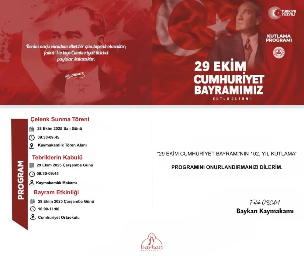 Kutlamalar, 28 Ekim 2025 Salı günü saat 09.30’da Kaymakamlık Tören Alanı’nda gerçekleştirilecek Çelenk Sunma Töreni ile başlayacak.