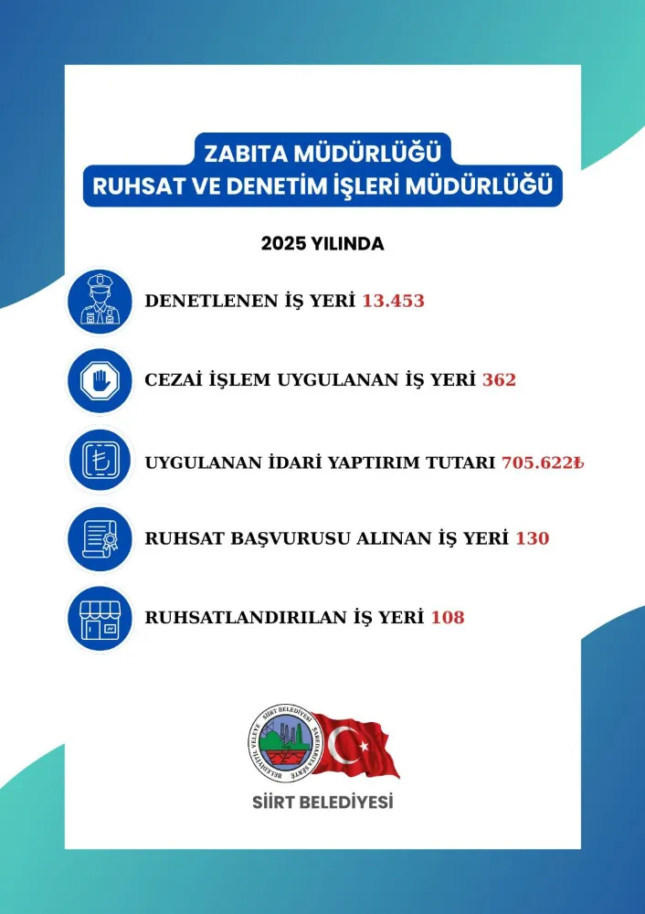 Siirt Belediyesi Zabıta Müdürlüğü ile Ruhsat ve Denetim İşleri Müdürlüğü ekipleri, 2025 yılı boyunca kent genelinde yürüttükleri çalışmalarla kamu düzeni, halk sağlığı ve ticari faaliyetlerin mevzuata uygunluğunu sağlamak amacıyla kapsamlı denetimler gerçekleştirdi.