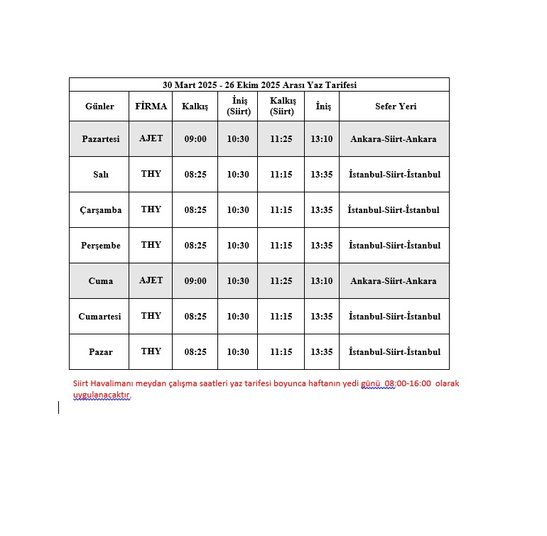 30 Mart 2025 - 26 Ekim 2025 tarihleri arasında geçerli olacak yaz tarifesine göre Siirt Havalimanı’ndan haftanın her günü düzenli uçuşlar gerçekleştirilecektir. Uçuş Programı: • Pazartesi ve Cuma günleri: AJET firması tarafından Ankara-Siirt-Ankara seferleri yapılacaktır. Kalkış: 09:00, Siirt'e iniş: 10:30 | Siirt'ten kalkış: 11:25, varış: 13:10 • Salı, Çarşamba, Perşembe, Cumartesi ve Pazar günleri: THY tarafından İstanbul-Siirt-İstanbul seferleri düzenlenecektir. Kalkış: 08:25, Siirt'e iniş: 10:30 | Siirt'ten kalkış: 11:15, varış: 13:35 Ayrıca, Siirt Havalimanı’nın çalışma saatleri yaz tarifesi süresince haftanın yedi günü 08:00-16:00 arasında uygulanacaktır. Kamuoyuna saygıyla duyurulur. SİİRT HAVA MEYDANLARI İŞLETME MÜDÜRLÜĞÜ