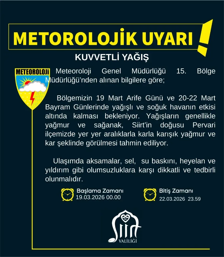 Siirt ve çevresi için önemli bir meteorolojik uyarı yapıldı. Meteoroloji Genel Müdürlüğü 15. Bölge Müdürlüğü’nden alınan bilgilere göre, 19 Mart Arife Günü ile 20-22 Mart tarihlerini kapsayan bayram süresince bölgede yağışlı ve soğuk hava etkili olacak.