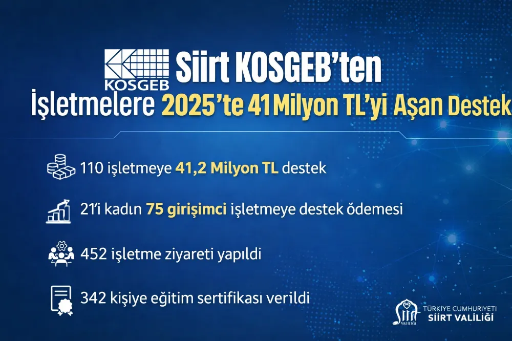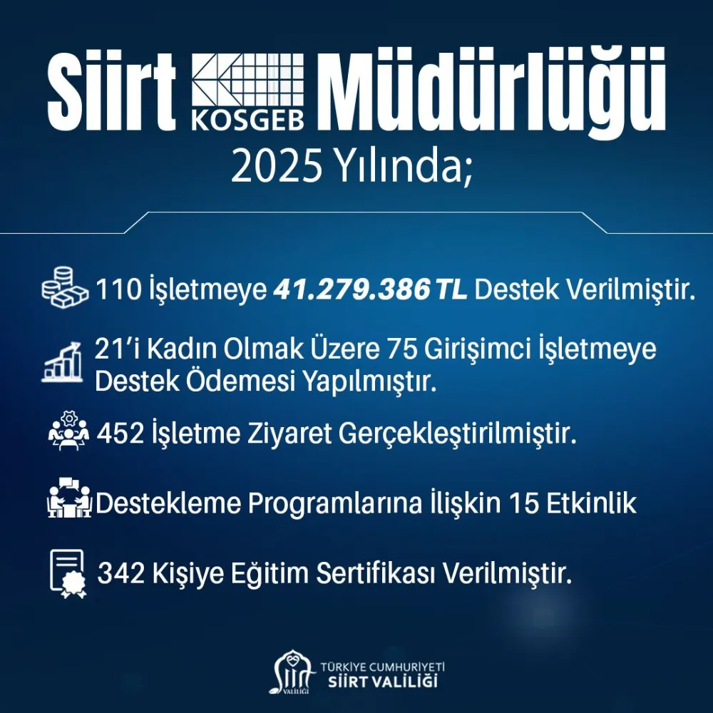 Siirt KOSGEB Müdürlüğü, 2025 yılı boyunca girişimcilik ve işletme ekosistemini güçlendirmeye yönelik yürüttüğü çalışmaların sonuçlarını kamuoyuyla paylaştı.