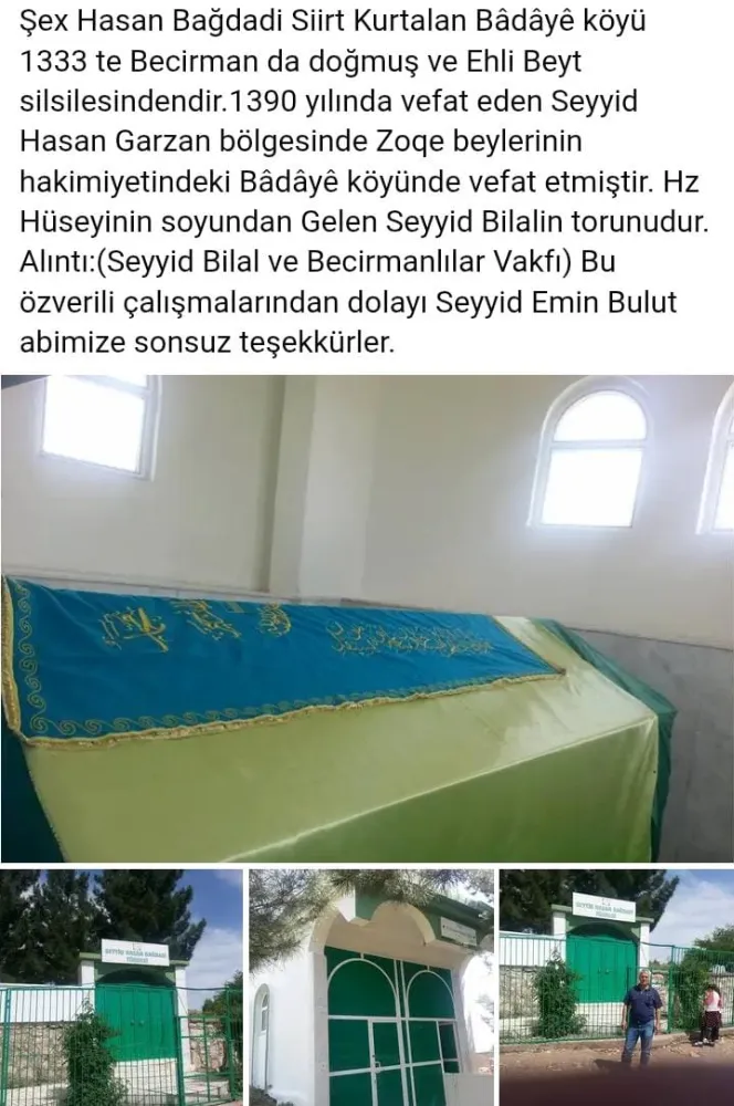 Seyyid Hasan-ı Bağdadi’nin 1333 yılında Becirman’da doğduğu, 1390 yılında ise Garzan bölgesinde, Zoqe beylerinin hâkimiyetindeki Badaye köyünde vefat ettiği rivayet edilmektedir.