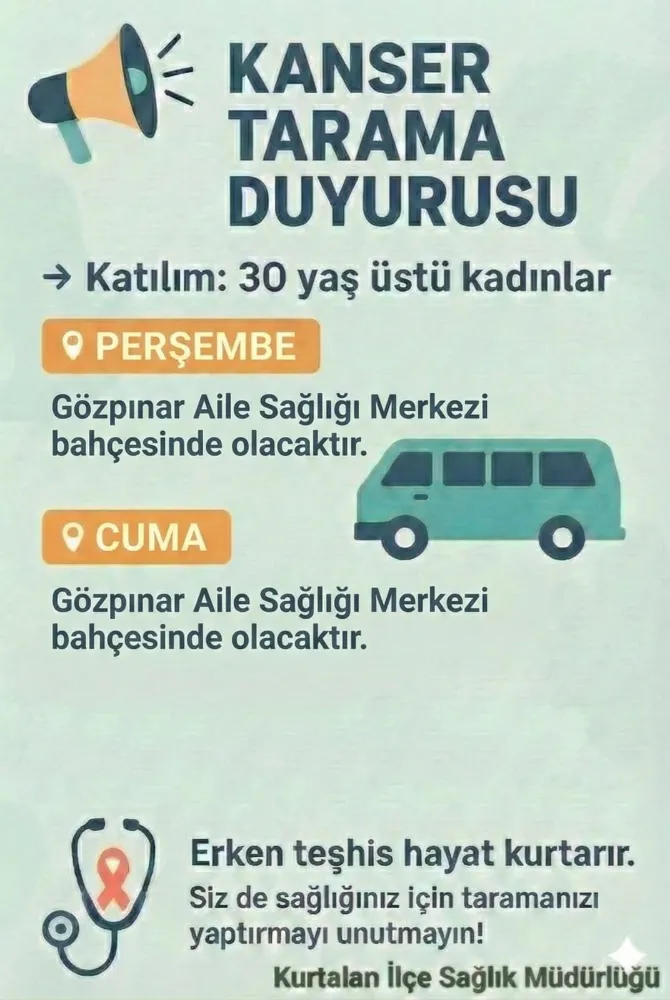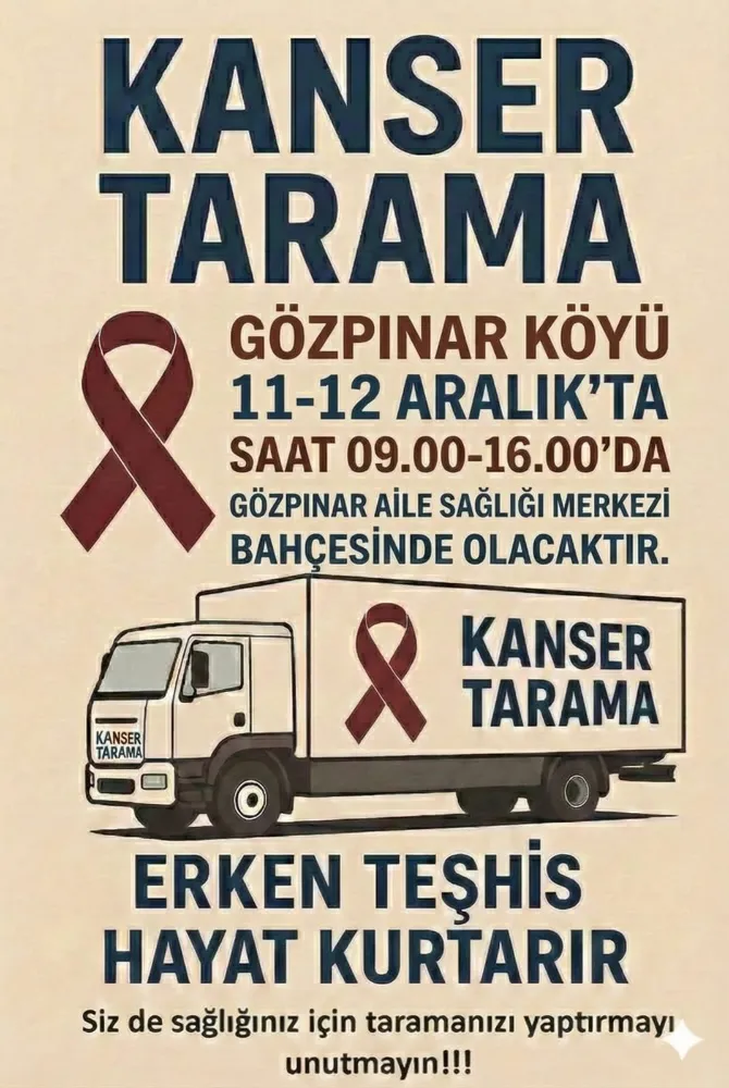 Taramalar bugün 09.00 ile 16.00 saatleri arasında Gözpınar Aile Sağlığı Merkezi bahçesinde gerçekleştirilecek. Yetkililer, erken teşhisin hayat kurtardığını vurgulayarak, vatandaşları programa katılmaya davet ediyor.